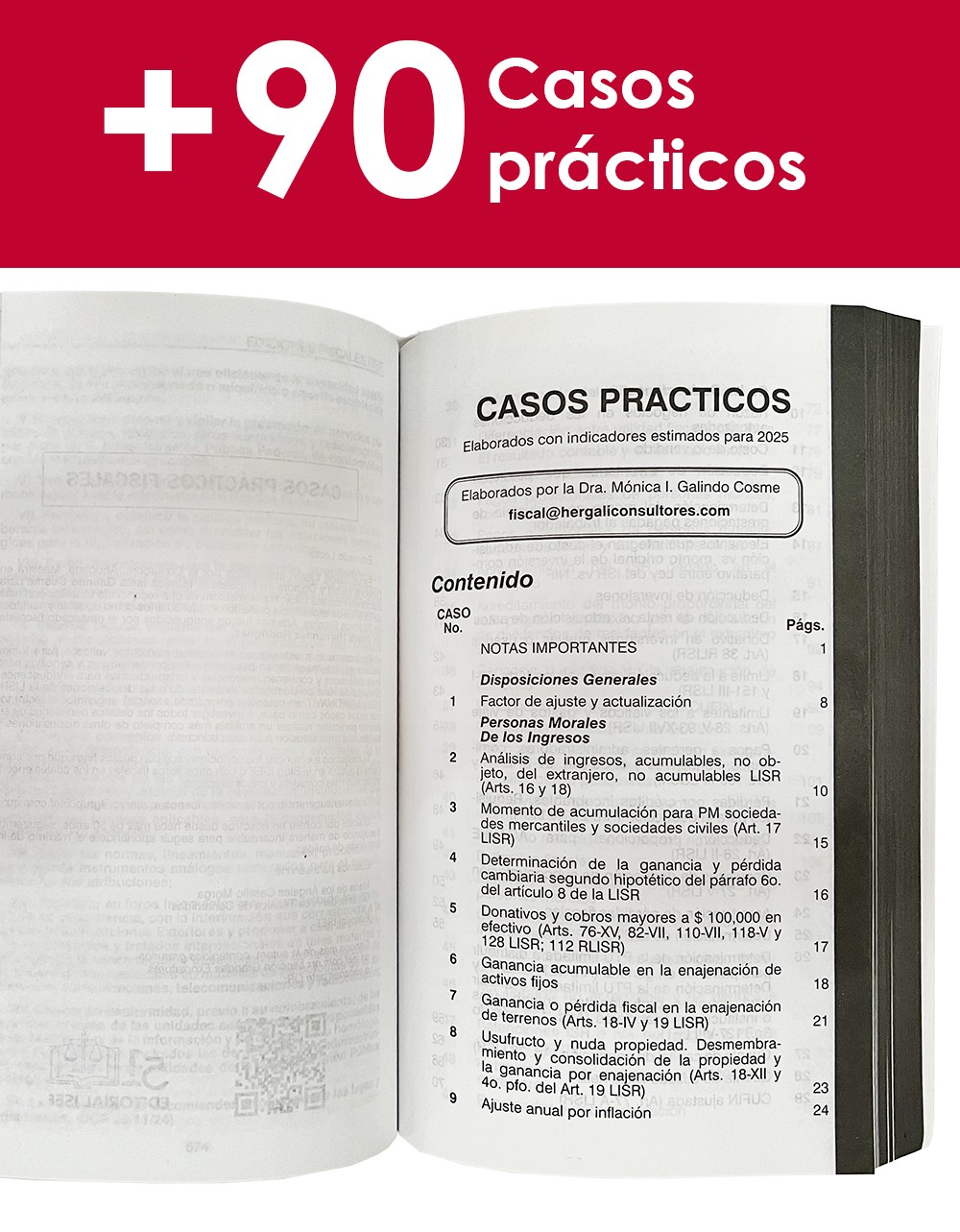 - Libro de complemento con más de 90 casos prácticos elaborados por expertos y este año 56 nuevos cuadros y esquemas fiscales hechos por la Contadora, Abogada, Maestra en Derecho Fiscal y Dra. en Impuestos Mónica I. Galindo